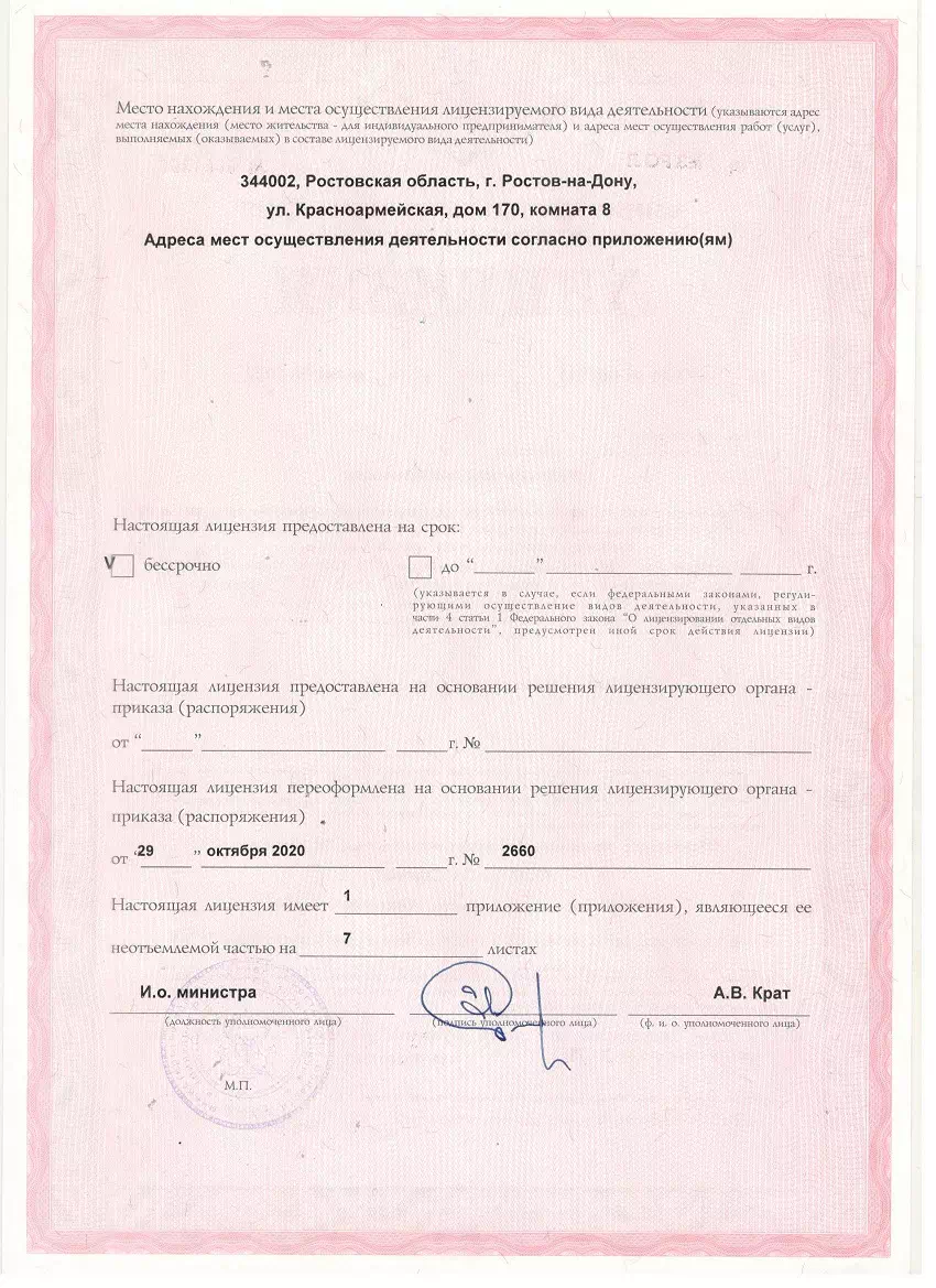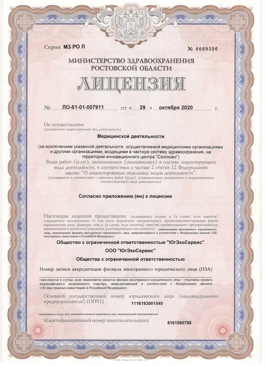 Лицензия на медицинскую деятельность Л041-01050-61/00357506 от 29.10.2020